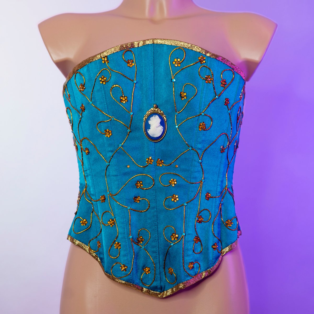 Corset estructurado en satén, con pedrería incrustada y bordado a mano. Incluye un camafeo decorativo que añade un aire clásico y teatral. Ideal para elevar cualquier look escénico o ceremonial con un toque de sofisticación.