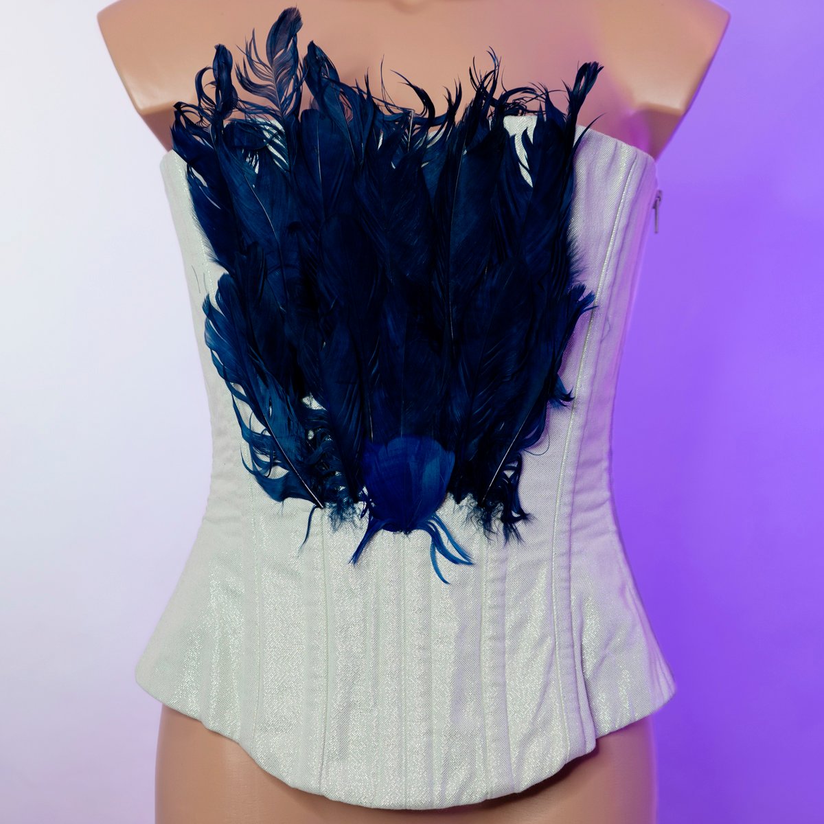 Corset rígido en tono blanco roto con brillos. Las plumas azules decorativas añaden volumen y fantasía, creando una silueta etérea y poderosa.