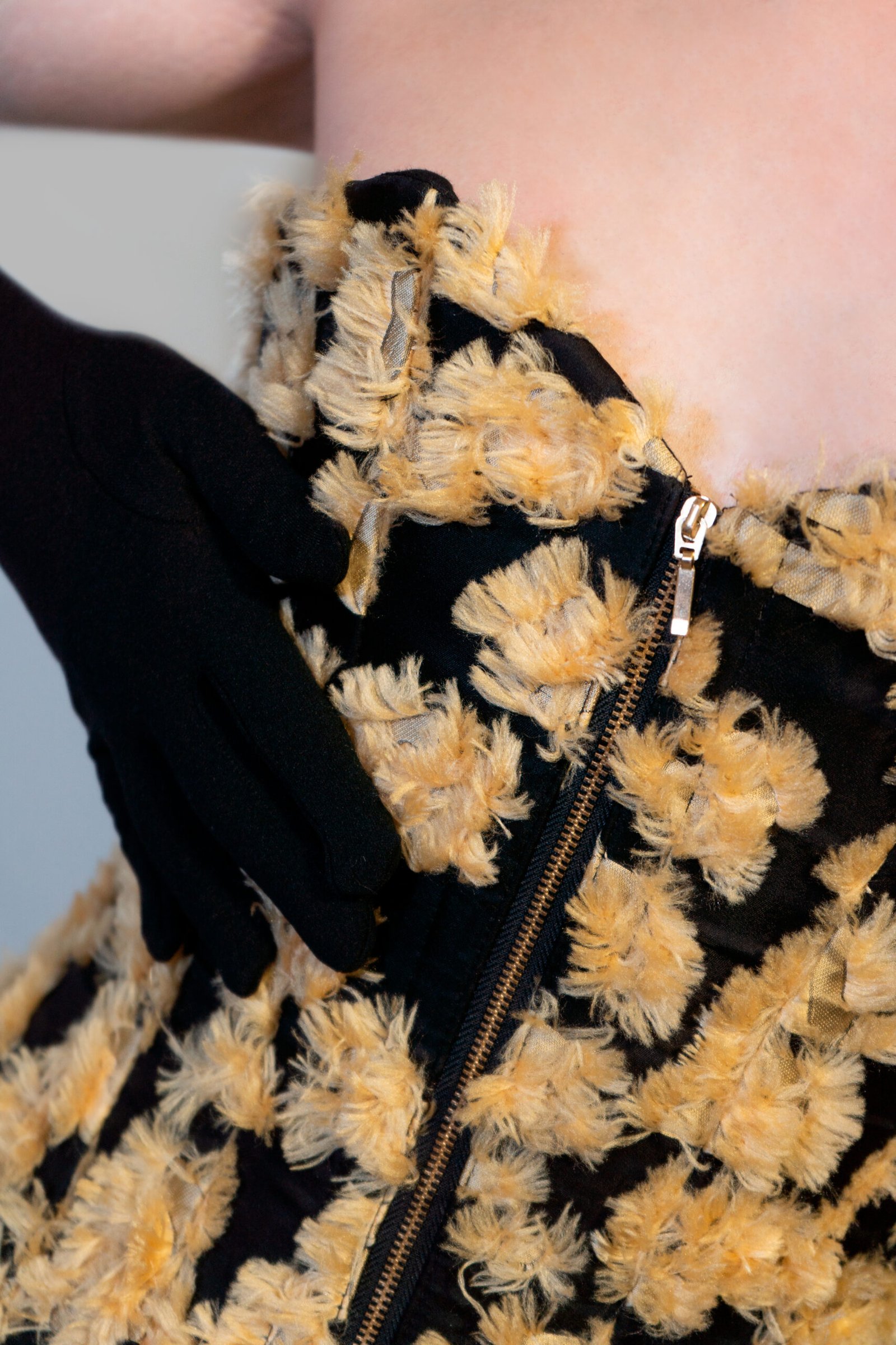 Corset rígido confeccionado en organza negra, decorado con pequeñas plumas beige que aportan textura y volumen sin perder ligereza. Una pieza delicada y escénica, ideal para looks oníricos o editoriales.