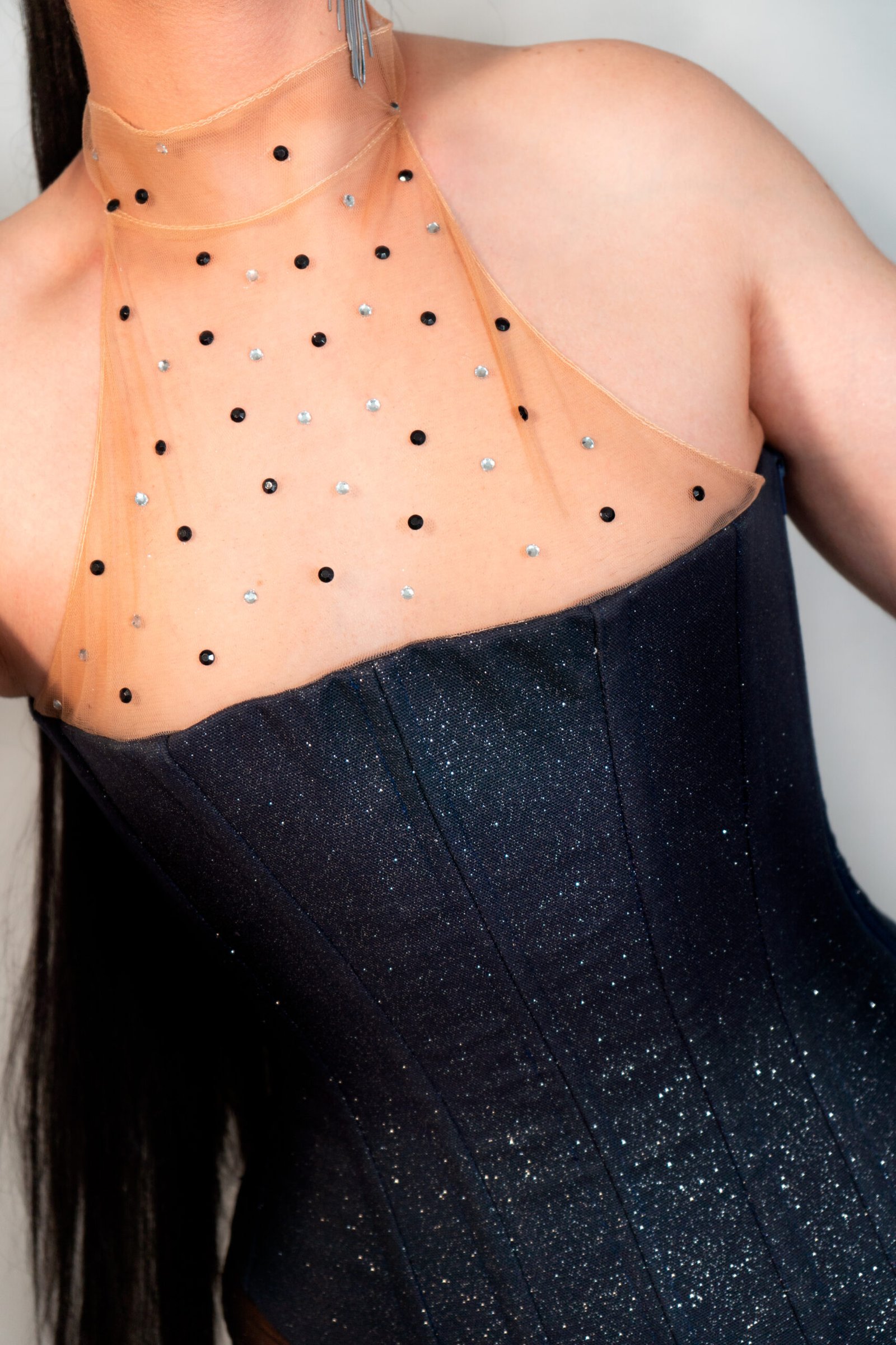 Corset rígido en tono azul con destellos plateados, ideal para looks escénicos con fuerza y luz. El escote está rematado con tul transparente decorado con pedrería, aportando un acabado delicado y brillante. Una prenda con presencia.