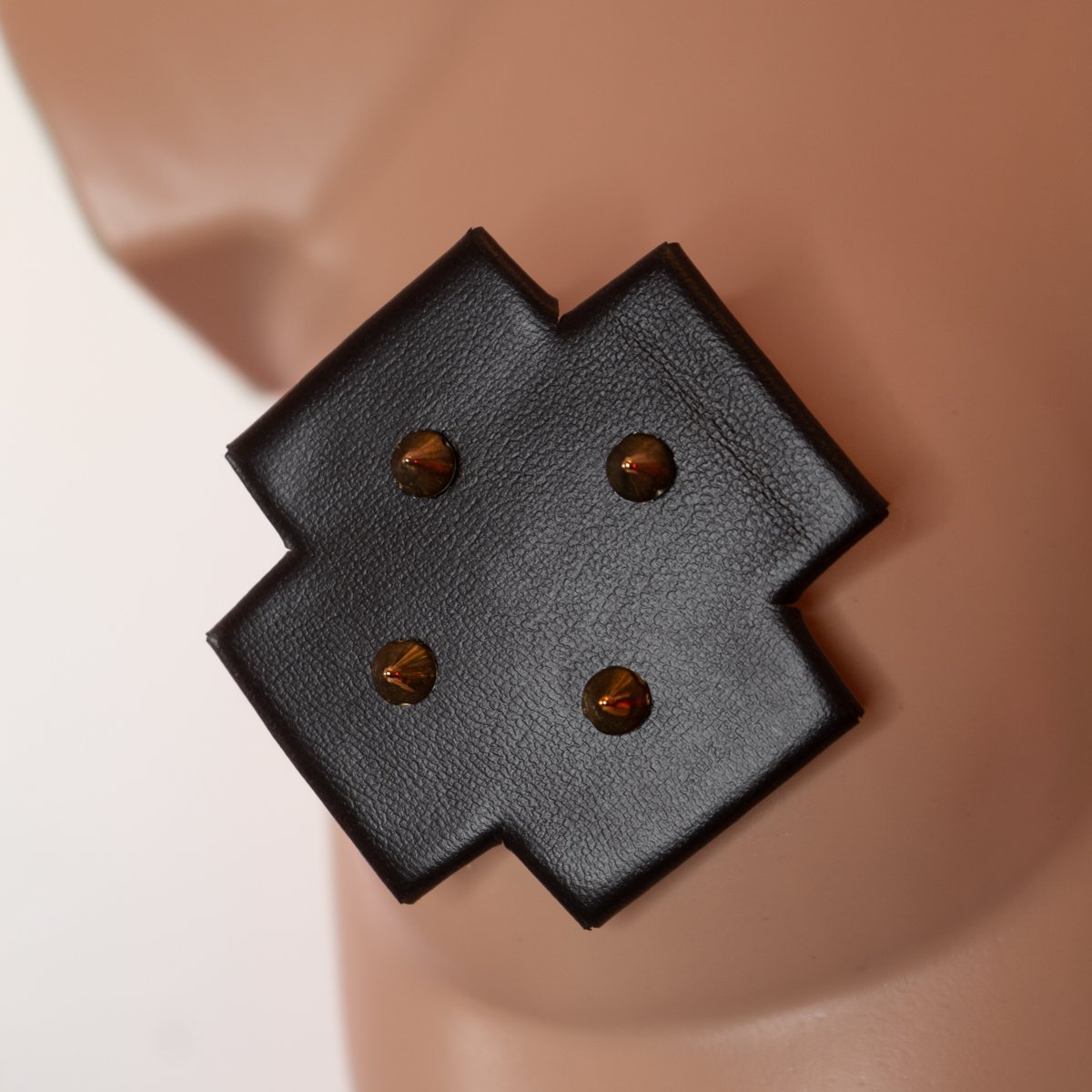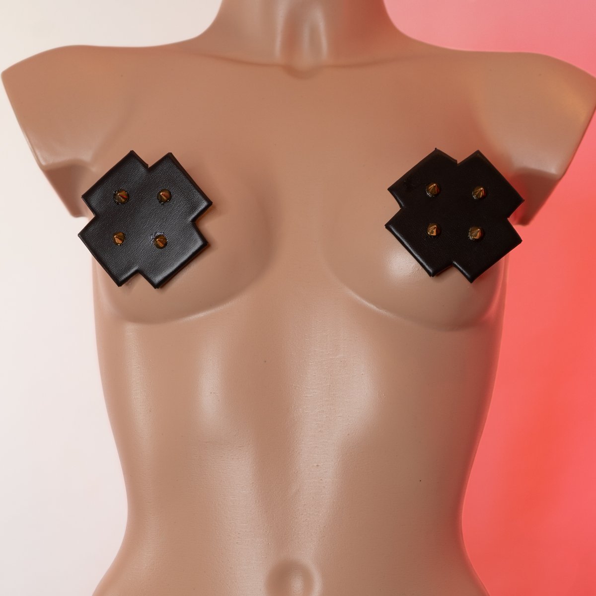 Pezoneras en forma de cruz, confeccionados en un elegante color negro con pinchos dorados. Talla única, fabricados con materiales cómodos y de calidad. Medida aproximada: diámetro de 6 cm por pezonera.